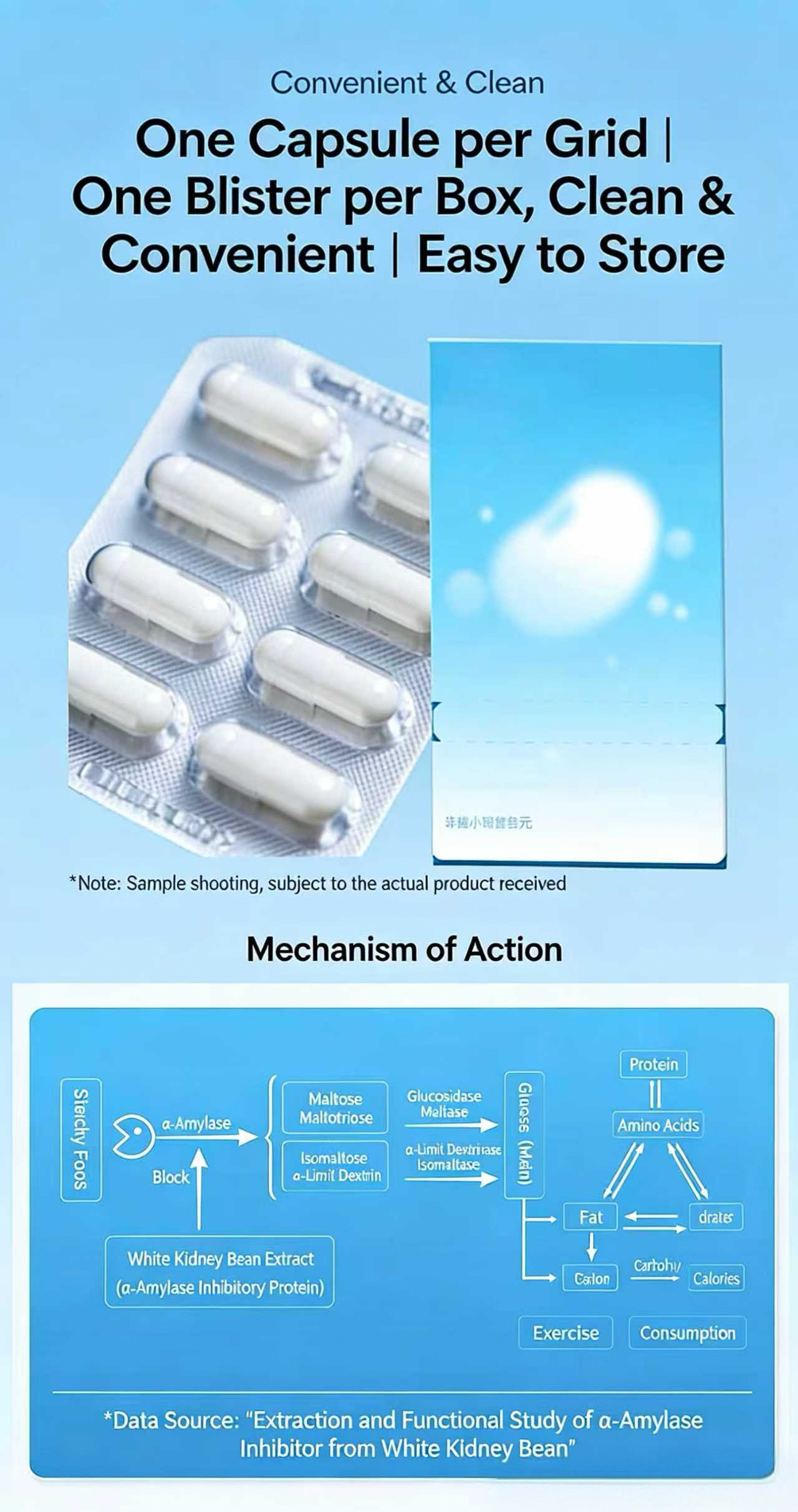No centro da eficácia comprovada do nosso extrato estão seus inibidores concentrados e bioativos de α-amilase. A α-amilase é a principal enzima digestiva responsável pela decomposição de carboidratos complexos – incluindo amidos de arroz, macarrão, pão, batata e grãos integrais – em açúcares simples para absorção intestinal. Ao ligar-se seletivamente a esta enzima, o nosso extrato inibe parcialmente a sua atividade, reduzindo a degradação e absorção calórica dos amidos dietéticos. Criticamente, este mecanismo suave à base de plantas não perturba a digestão e absorção de proteínas, gorduras saudáveis, vitaminas ou minerais essenciais. Ao contrário das alternativas sintéticas agressivas, o nosso extrato funciona em harmonia com o sistema digestivo natural do corpo, tornando-o adequado para uso diário e a longo prazo como parte de um estilo de vida equilibrado e focado na saúde.